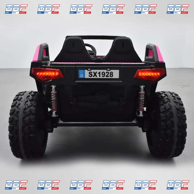 Ce sont quatre énormes roues en gomme qui se chargent du grip démesuré de l’engin. Ce buggy crawler 24 volts 4 moteurs est peut-être né pour le franchissement, il n’en oublie pas moins le style et offre des feux fonctionnels LED à l’avant comme à l’arrière. De série, ce buggy propose les portes ouvrantes et la ceinture de sécurité. La finition de l’assise en similicuir 2 places impressionne pour un véhicule de ce type. Il y a du monde qui va se bousculer au portillon lorsque Bébé Pilote va sortir le bolide du garage…. Tout le monde va vouloir l’essayer. Ce buggy 24 Volts 4 moteurs Crawler est un As de la campagne et des chemins de terre, mais il est tout aussi à l’aise en ville. Qui peut le plus, peut le moins.