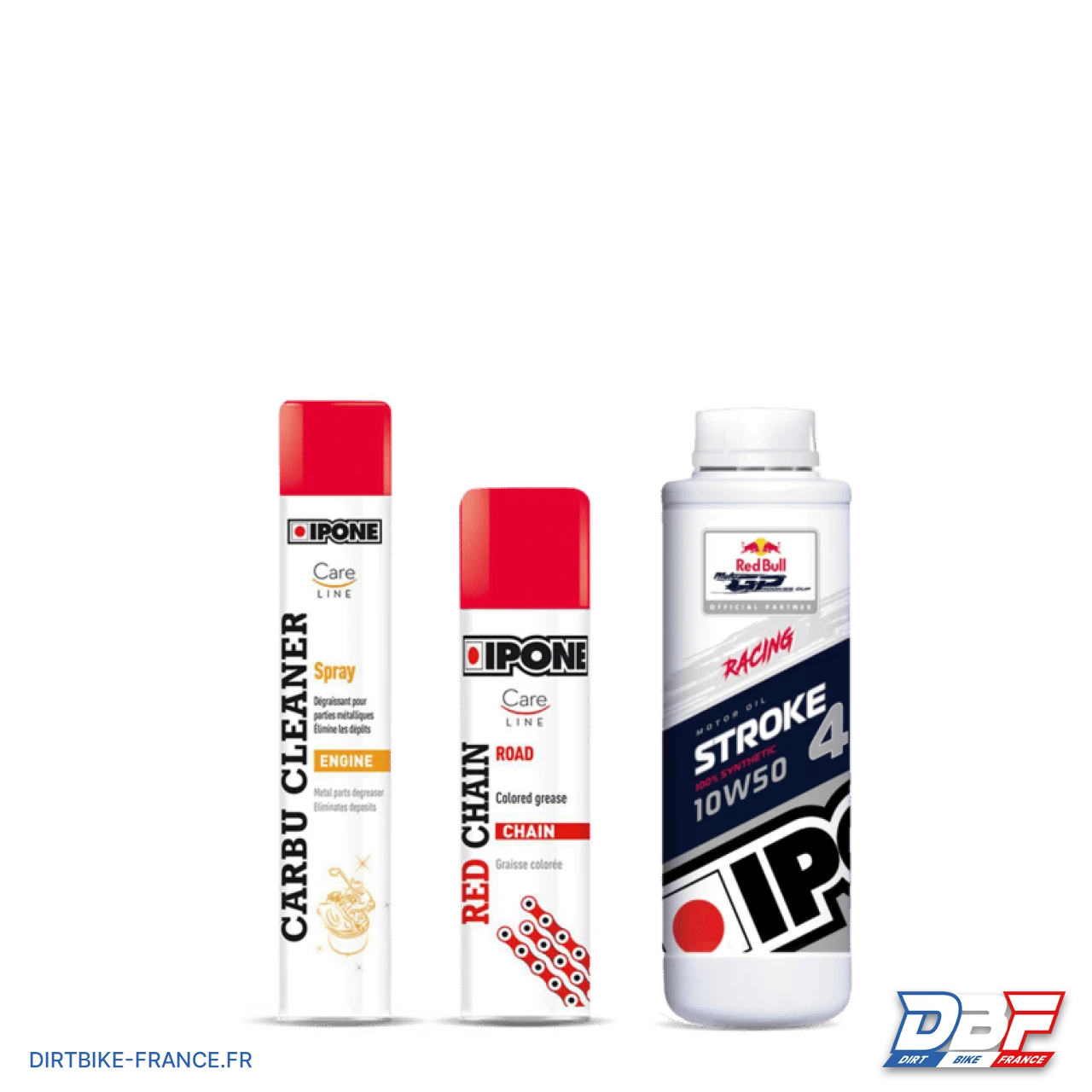 Vous venez d’acheter un Dirt Bike / Pit Bike 50cc, 88cc, 110cc, 125cc, 140cc, 150cc ou 160cc ? Optez pour le Pack de mise en route pour faire votre première vidange à réception de la Moto, graisser votre chaîne après chaque sortie ainsi que le nettoyage régulier de votre carburateur. Une huile de stockage est présente dans votre Dirt Bike / Pit Bike / Moto : il faut la remplacer par de l’huile 10W40 ou 10W50. Ce pack comprend : 1x Spray nettoyant de carburateur IPONE 750 ml, 1x Spray graisse à chaîne rouge IPONE 250 ml, 1x Bidon huile moteur 4t ipone stroke 4 racing 100% synthèse 10w50 1l. Comment entretenir votre Dirt Bike / Pit Bike ? N’hésitez pas à nous contacter par e-mail afin d’avoir plus de conseils!