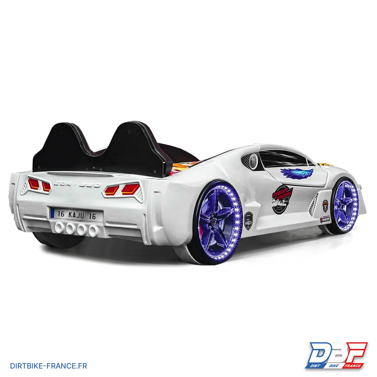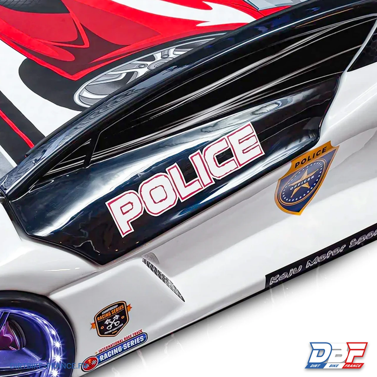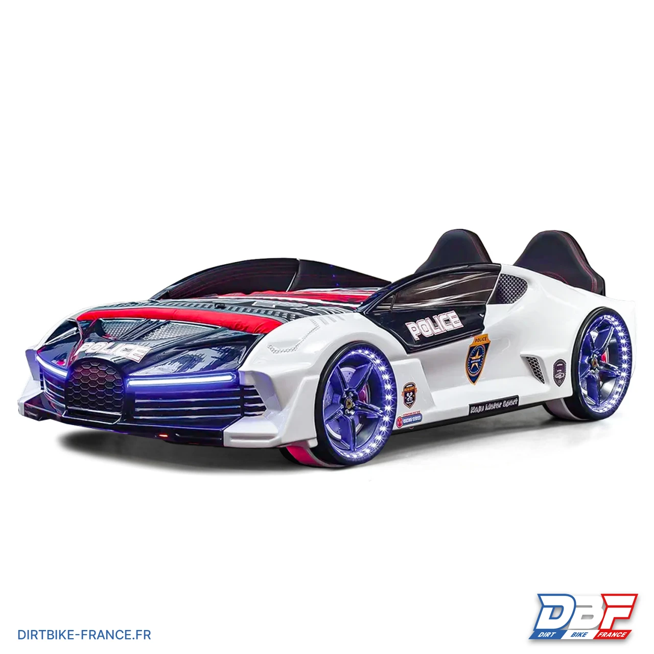 Le lit voiture enfant MOON POLICE (KRD) est idéal pour les petits amateurs de voitures de police. Avec ses effets sonores, ses feux avant et ses LED aux roues, ce lit est parfait pour stimuler l’imagination des enfants. Il est également équipé d’une télécommande pour plus de fun. Le rembourrage en simili cuir sur les côtés et à l’arrière assure un confort optimal. Les dimensions du lit monté sont de 246 x 132 x 59cm, avec des lattes fixées directement sur le lit. Matelas non fourni. Offrez à votre enfant un espace de sommeil ludique et sécurisé avec ce lit voiture de police.