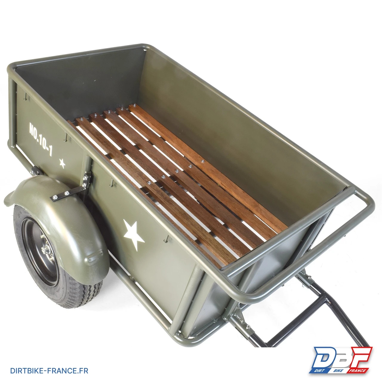 La remorque pour jeep enfant est une exclusivité aux Jeep enfant 150cc et électrique XTRM Factory 81 ! Entièrement en métal avec un plancher ajouré en bois épais, cette remorque complète à merveille les Jeep 150cc et électrique. Avec une grande capacité de 99 x 59 x 28 cm et une longueur totale de 1m 82, cette remorque est un engin de loisir complémentaire de la jeep enfant. Attention, pour jeep modèle octobre 2019 et ultérieur. Ne peut pas s’adapter aux modèles antérieurs. La charge doit être uniformément répartie, ne pas excéder 15 Kg et la vitesse doit être inférieure à 15 Km/h. L’utilisation de la remorque doit se faire sur terrain plat et régulier.
