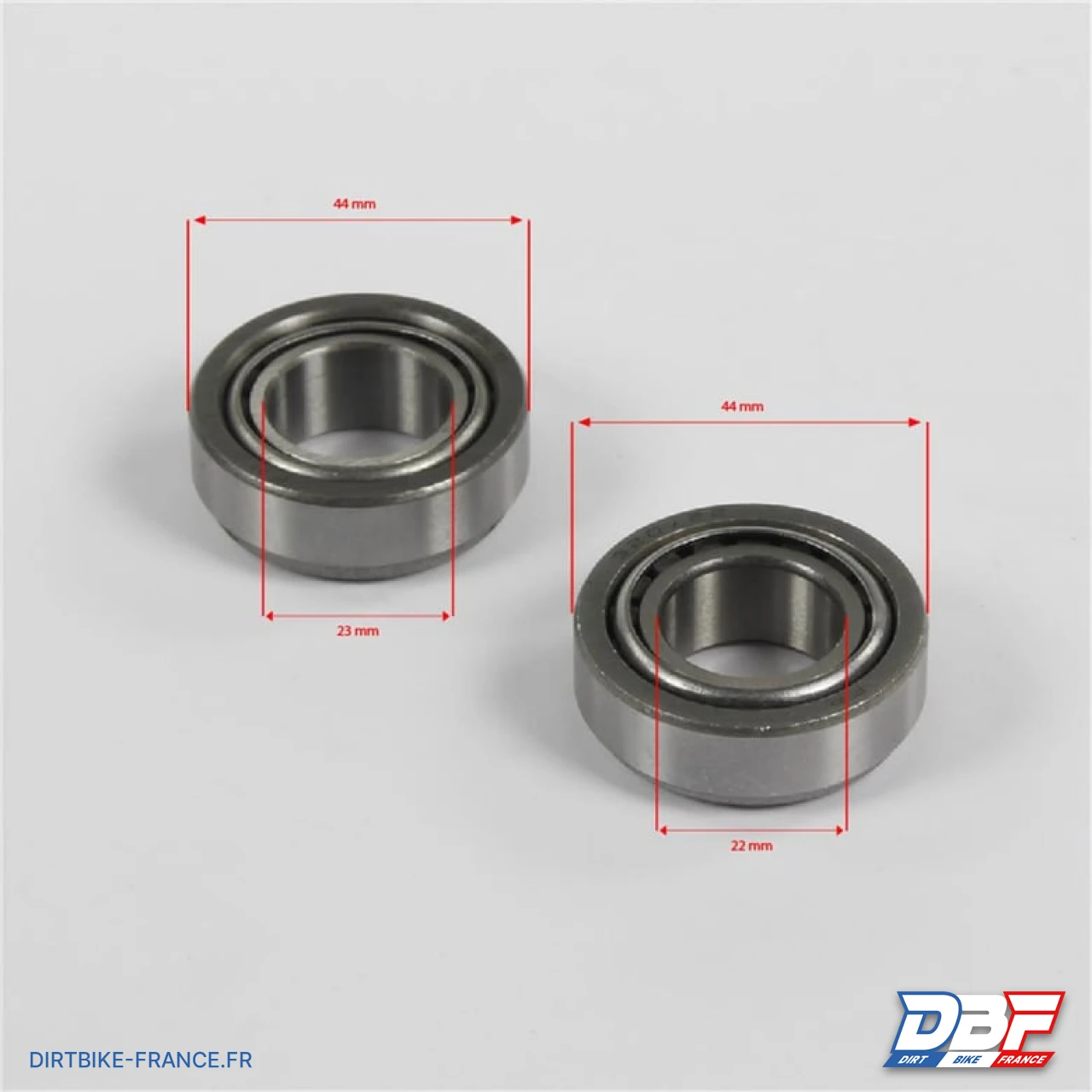 Ce kit roulement conique de direction est compatible avec la plupart des marques de Dirt Bike et de Pit Bike du marché. Ce kit contient le roulement inférieur et le roulement supérieur avec leurs cuvettes. Remontez le tout en mettant abondamment de la graisse pour roulement. Assurez-vous de bien entretenir la direction de votre véhicule pour une conduite optimale et sécurisée. Profitez de ce kit de roulements de qualité à un prix abordable sur Dirt Bike France.