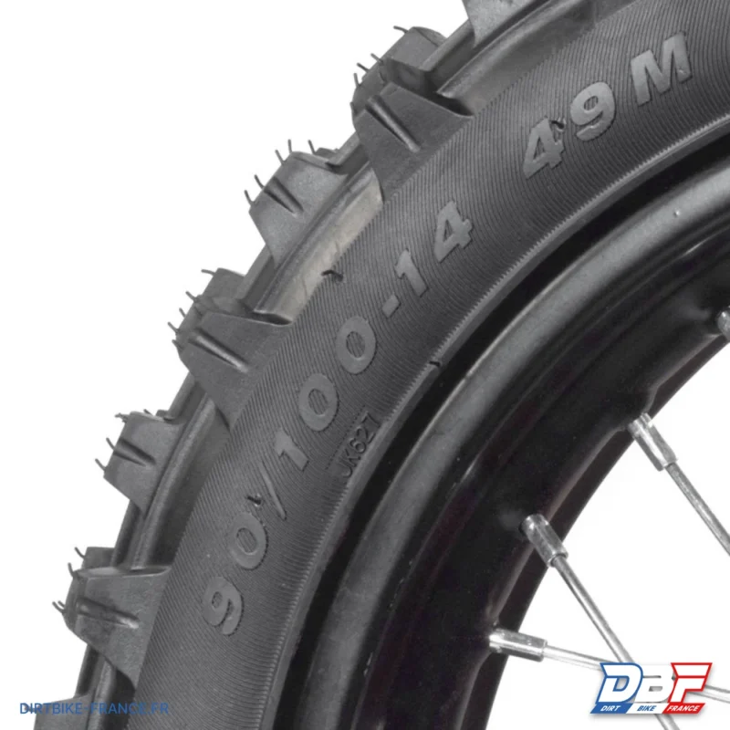 La roue arrière 14″ pour dirt bike est livrée avec chambre à air et pneu montés. Elle est livrée sans disque et sans couronne. La vérification de la pression du pneu et des tensions de rayons incombent au client. Dimensions : 90/100-14. Cette roue arrière est idéale pour les amateurs de dirt bike en quête de performance et de fiabilité.