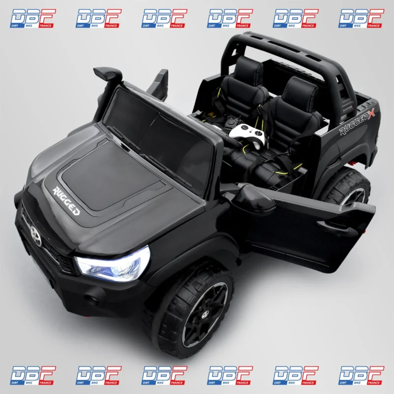 Les portes ouvrantes de ce Toyota Hilux électrique enfant 24 volts ajoutent une touche de réalisme bienvenue et laissent apparaitre une assise en similicuir 2 places. Autre avantage ; ce sont deux harnais à 5 points d’attache qui assurent un maintien parfait dans toutes les conditions. Plutôt rassurant si le/la p’tit(e) pilote est adepte de franchissement sauvage et de croisement de ponts… Petite précision tout de même : le snorkel est là pour la déco, il est hors de question de traverser des gués avec une voiture électrique pour enfant… ça tombe sous le sens mais nous ne sommes jamais trop prudents.
